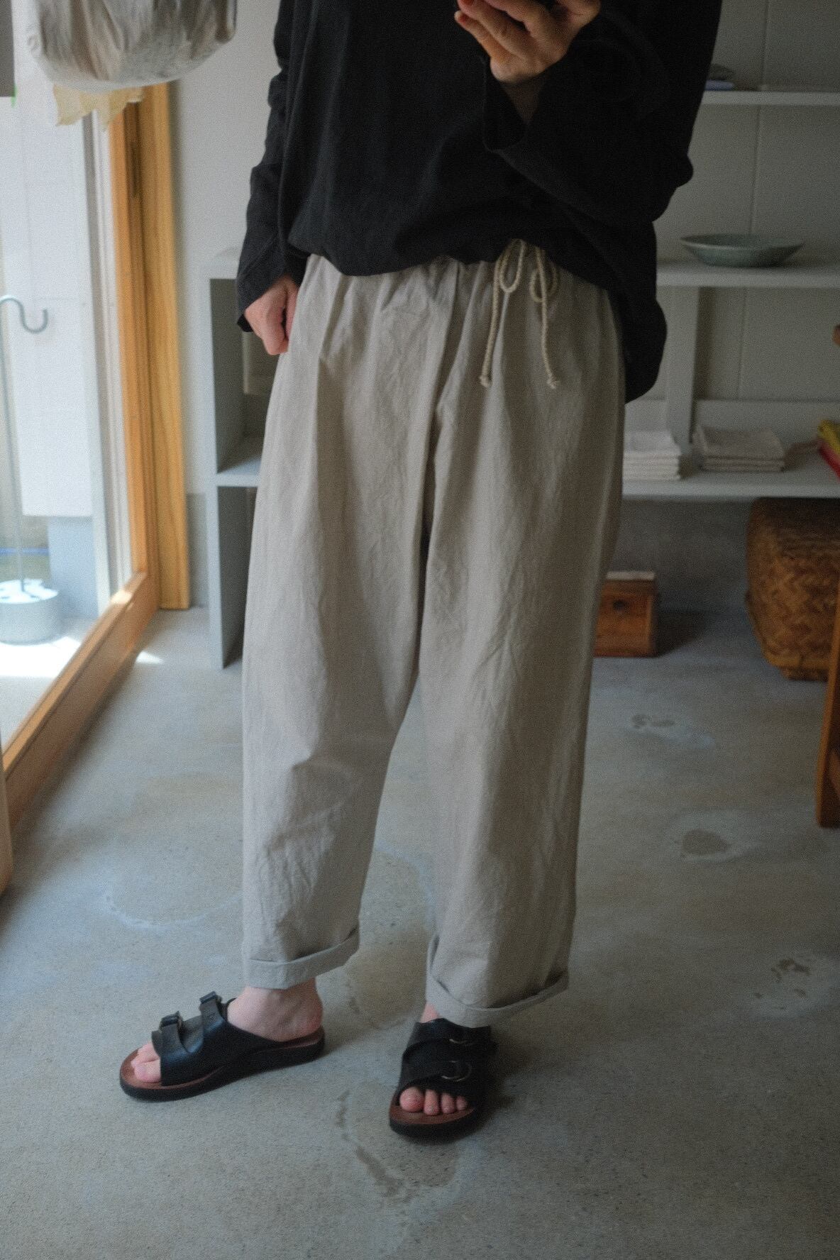 ウエスト部分はコットンヘンプ素材のコードでも調整可能。